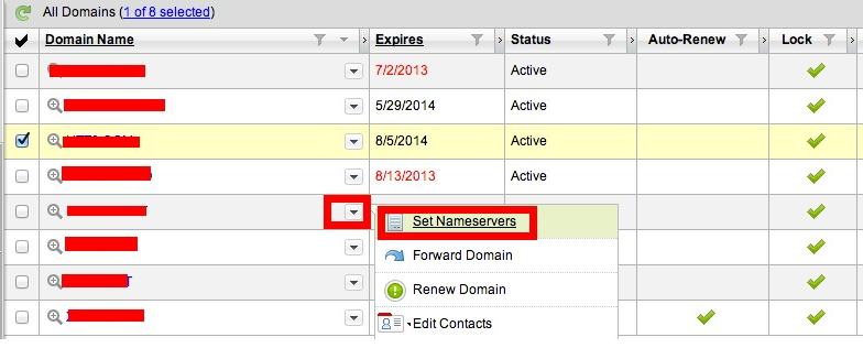 3、在域名列表中找到要修改要修改DNS的域名,然后点击该域名后的下拉图标(入下图所示),然后点击下拉列表中的 【Set NameServers】