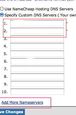 5、在输入框输入YUNDUN dns服务器: ns1.cloudcdns.com ns2.cloudcdns.com,点击[Add More Nameservers]
